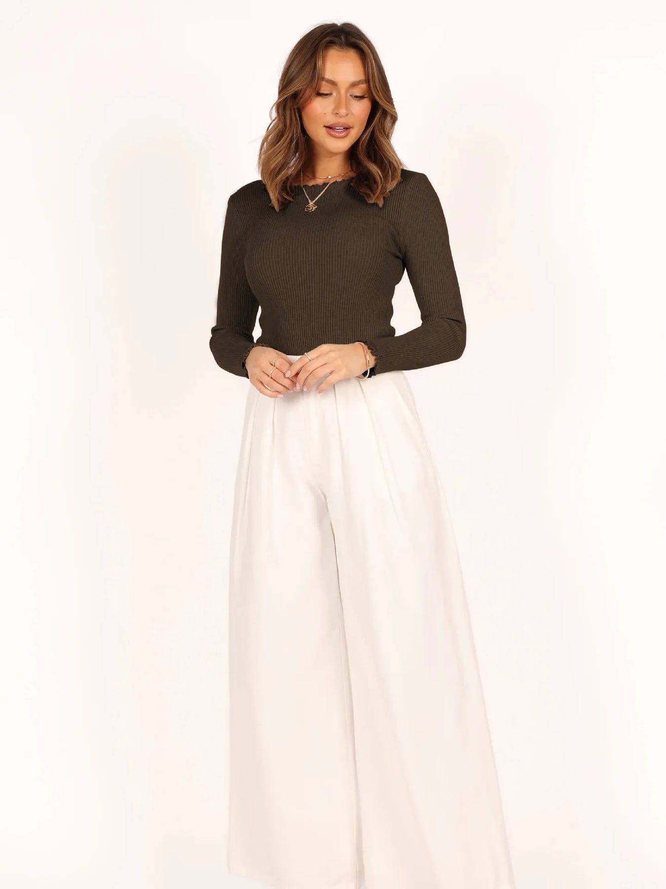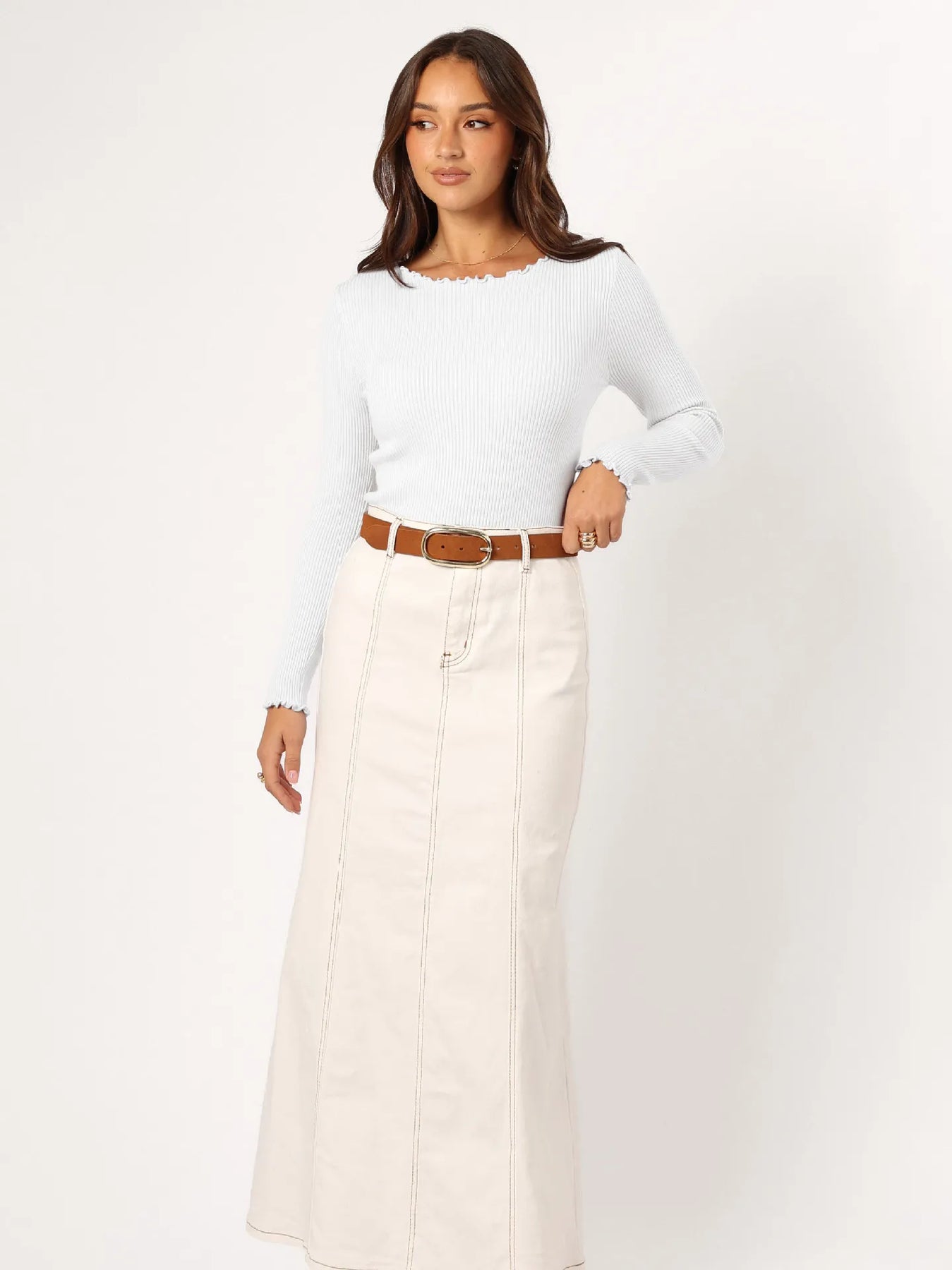 Dieses langärmelige Oberteil mit Rundhalsausschnitt ist eng anliegend und aus geripptem Stoff gefertigt, der die Figur schlank macht und den ganzen Tag über Komfort bietet. Sein vielseitiger Stil macht es zu einem unverzichtbaren Basic, das sich mit Hosen, Röcken oder Maßanzügen kombinieren lässt. Elegant und funktionell, eignet es sich sowohl für legere als auch für formellere Anlässe.