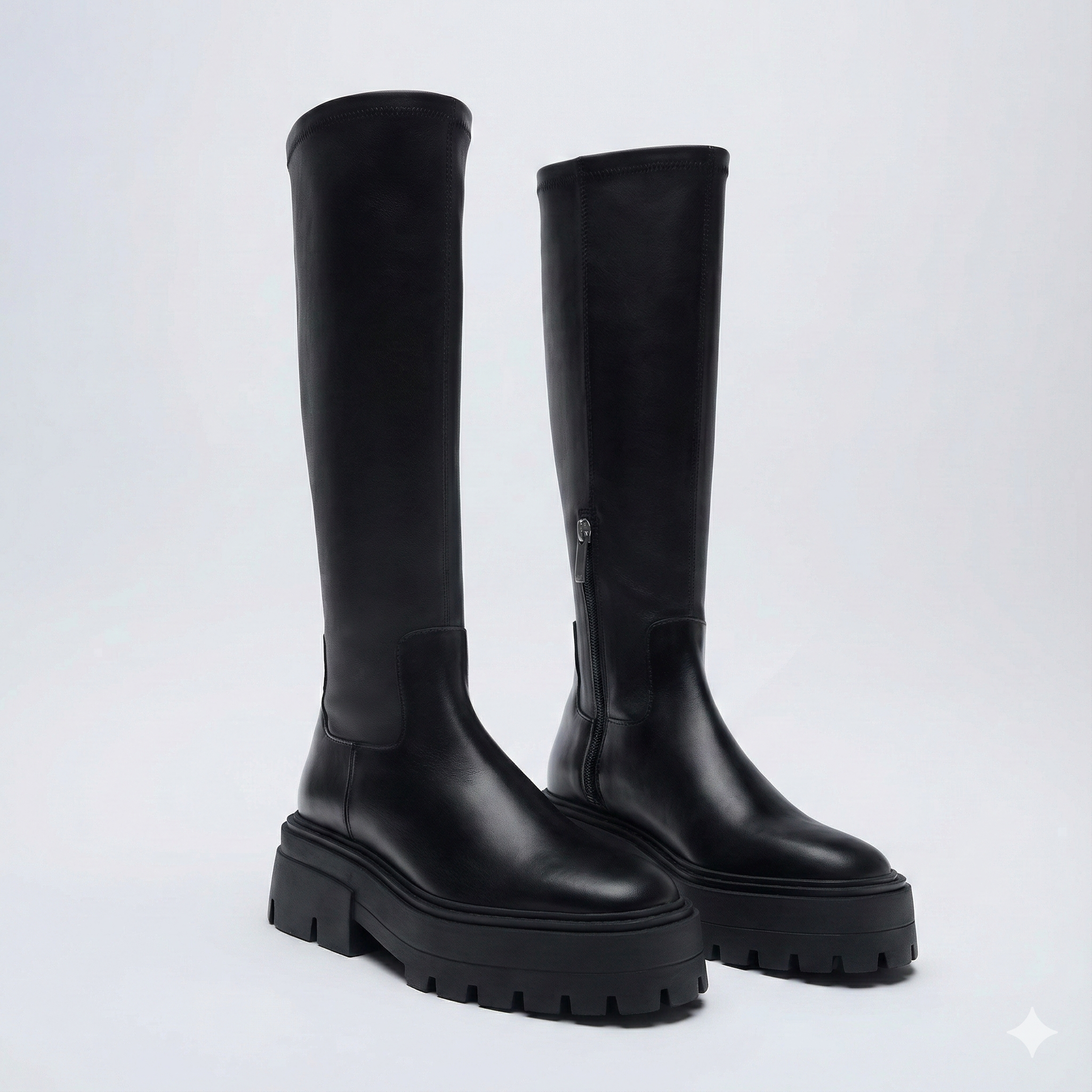 Diese Stiefel haben einen hohen Schaft mit fester Struktur und klaren Linien, die das Bein mit einer durchgehenden Passform umschließen. Die erhöhte Plattform integriert eine robuste Sohle, die Volumen und Stabilität ausgleicht, während der seitliche Reißverschluss die Passform erleichtert, ohne die Silhouette zu verändern.