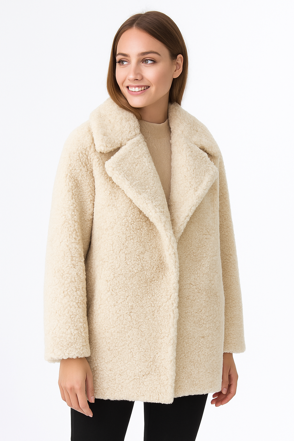 Dieser Mantel hat eine weiche, umhüllende Textur, die bei Kontakt sofort ein Gefühl von Wärme vermittelt. Seine flauschige Oberfläche schafft ein leichtes Volumen, das kalten Tagen standhält und gleichzeitig eine entspannte, moderne Ästhetik bewahrt. Die kurze Silhouette erleichtert die Bewegung und erlaubt es, sie mit verschiedenen Kleidungsstücken zu kombinieren, ohne an Komfort zu verlieren.