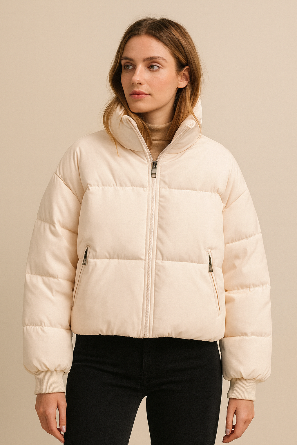 Diese Jacke hat ein weiches Volumen, das Sie an kalten Tagen angenehm einhüllt und gleichzeitig ein einheitliches Finish bietet, das gut zu Ihrer täglichen Routine passt. Der Stehkragen sorgt für sofortige Wärme, während die Steppung den Look ausgewogen und geschmeidig hält, ohne an Leichtigkeit zu verlieren.