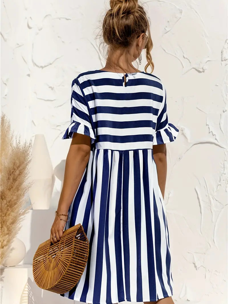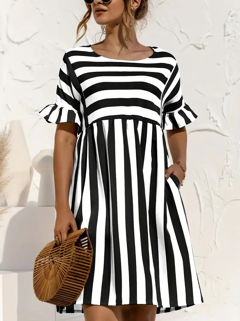 Ob für einen legeren oder formelleren Anlass, dieses gestreifte Kleid ist die perfekte Wahl, um stilvoll aufzufallen und sich sicher zu fühlen.