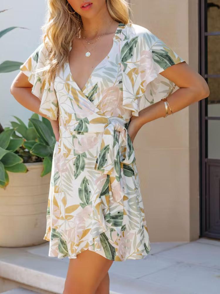 Heike - Bedrucktes Mini-Wickelkleid mit Rüschen und V-Ausschnitt