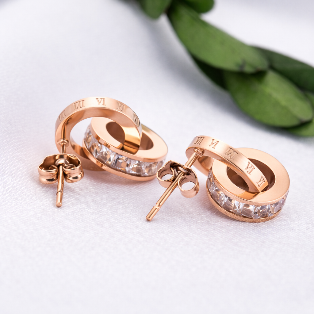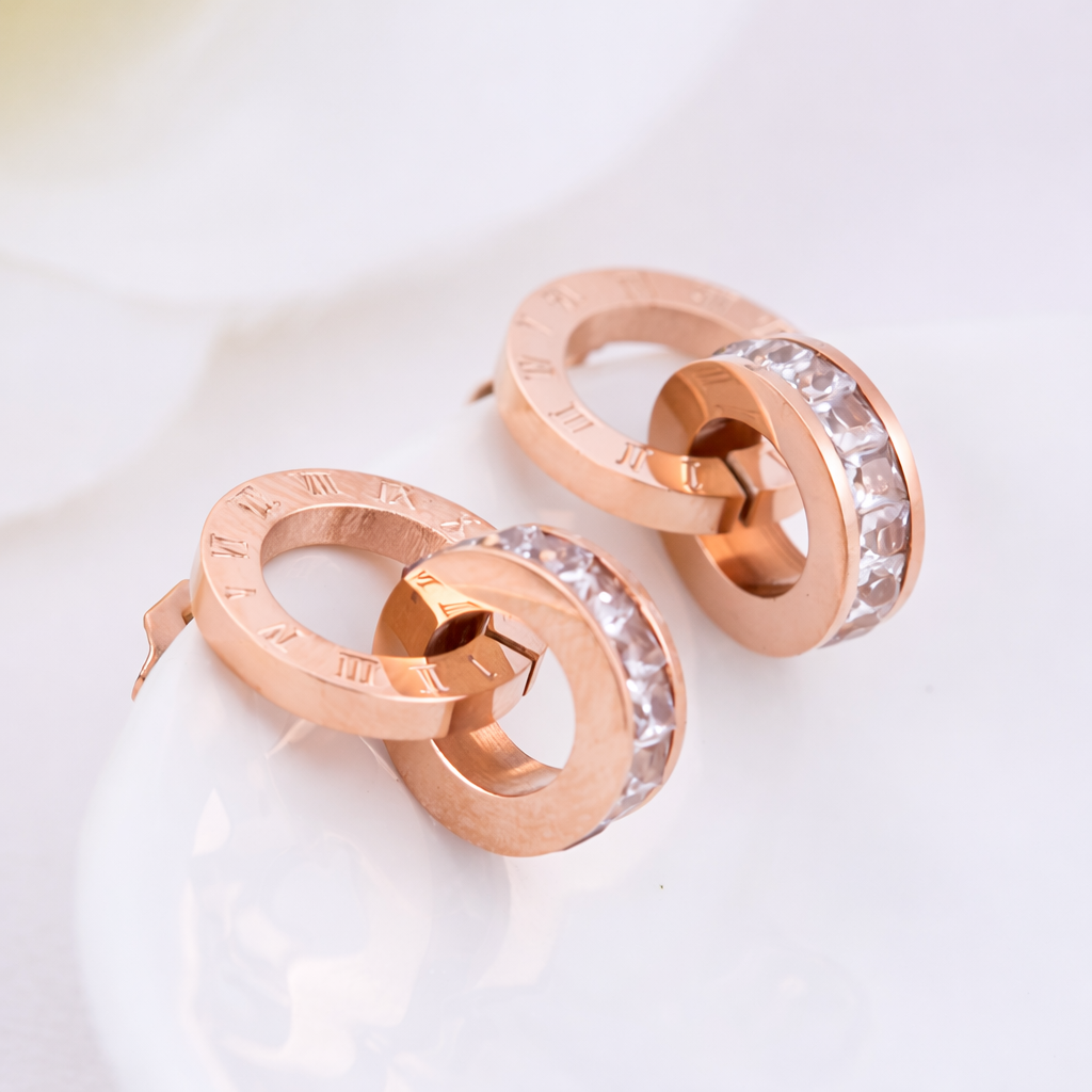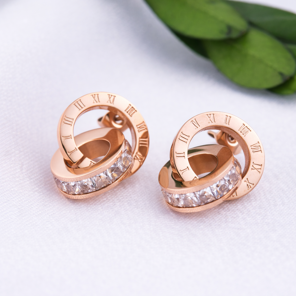 Roségoldfarbene Damenohrringe mit kreisförmigem, ineinandergreifendem Design. Jeder Reif verfügt über ein schlichtes Band mit eingravierten römischen Ziffern und ein weiteres Band, das mit kleinen klaren Kristallen verziert ist und einen klaren Kontrast zwischen glänzendem und poliertem Metall bildet.